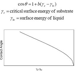 Wetting can be measured by the contact angle of a bead of liquid on the surface (figure 1). The more surface wets out, the smaller the contact angle Zisman’s equation (Figure 2 provides an empirical relationship relating the contact angle to the difference between the surface energies of the substrate and liquid).